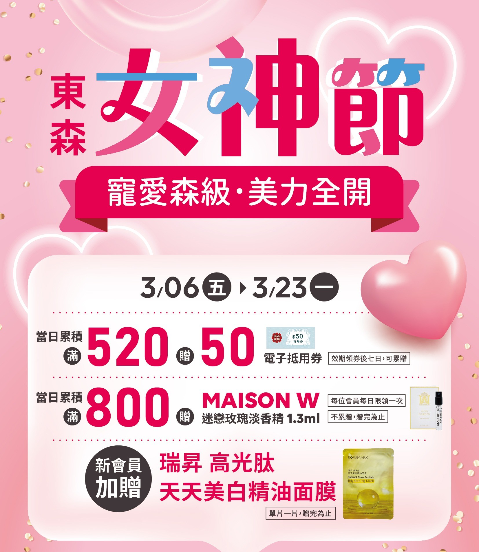 東森廣場也趁著3月檔期加碼話題,推出「東森女神節」促銷活動,從3月6日至3月23日祭出會員回饋與限時互動。活動期間當日累積消費滿520元,可獲贈50元電子抵用券;滿800元則再加碼贈送乙份MAISON W迷戀玫瑰淡香精1.3ml,鎖定女性消費族群的補貨與送禮需求。餐飲品牌也同步推出情人節限定優惠,其中洋城義大利麵推出「白色情人節套餐」,主打1314雙人套餐特價1314元(原價1888元),檔期自3月6日至3月23日;銷魂麵鋪則自3月6日至3月25日推出情人節活動,雙人半筋半肉套餐特價766元(原價886元),加碼送兩杯飲料與一份50元小菜,吸引情侶與朋友聚餐順道享優惠。